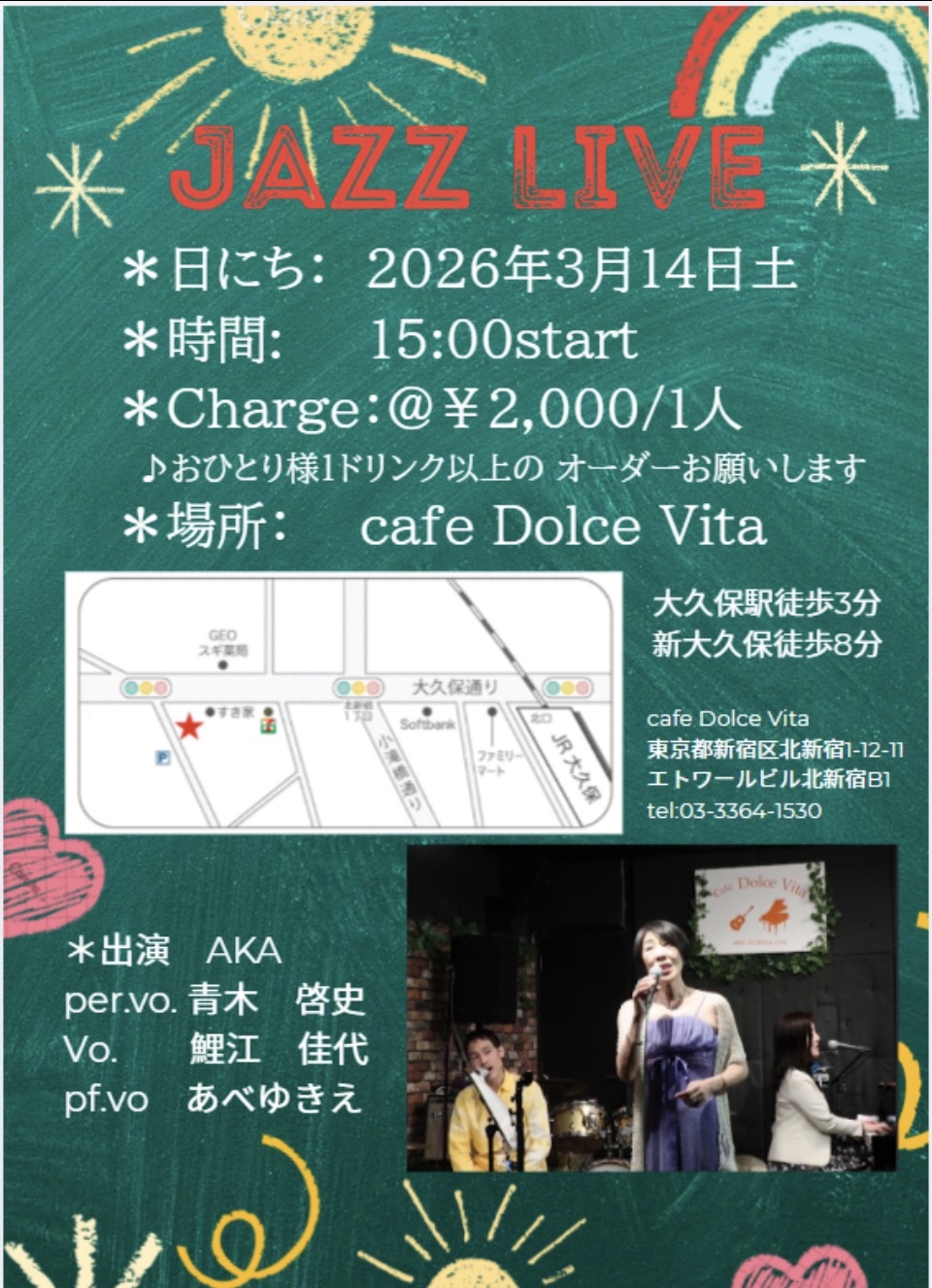 30 【北新宿歌声喫茶】 ホスト: 鈴木あい(Pf) atsuko.(Gt) 17:00open 17:30start 入場チャージ 2000円(order別) 1)鈴木あい&atsuko.の 生演奏で歌われる方 参加費一曲+3000円 2)カラオケや弾き語り等 お一人で歌われる方 参加費一曲+2000円 |